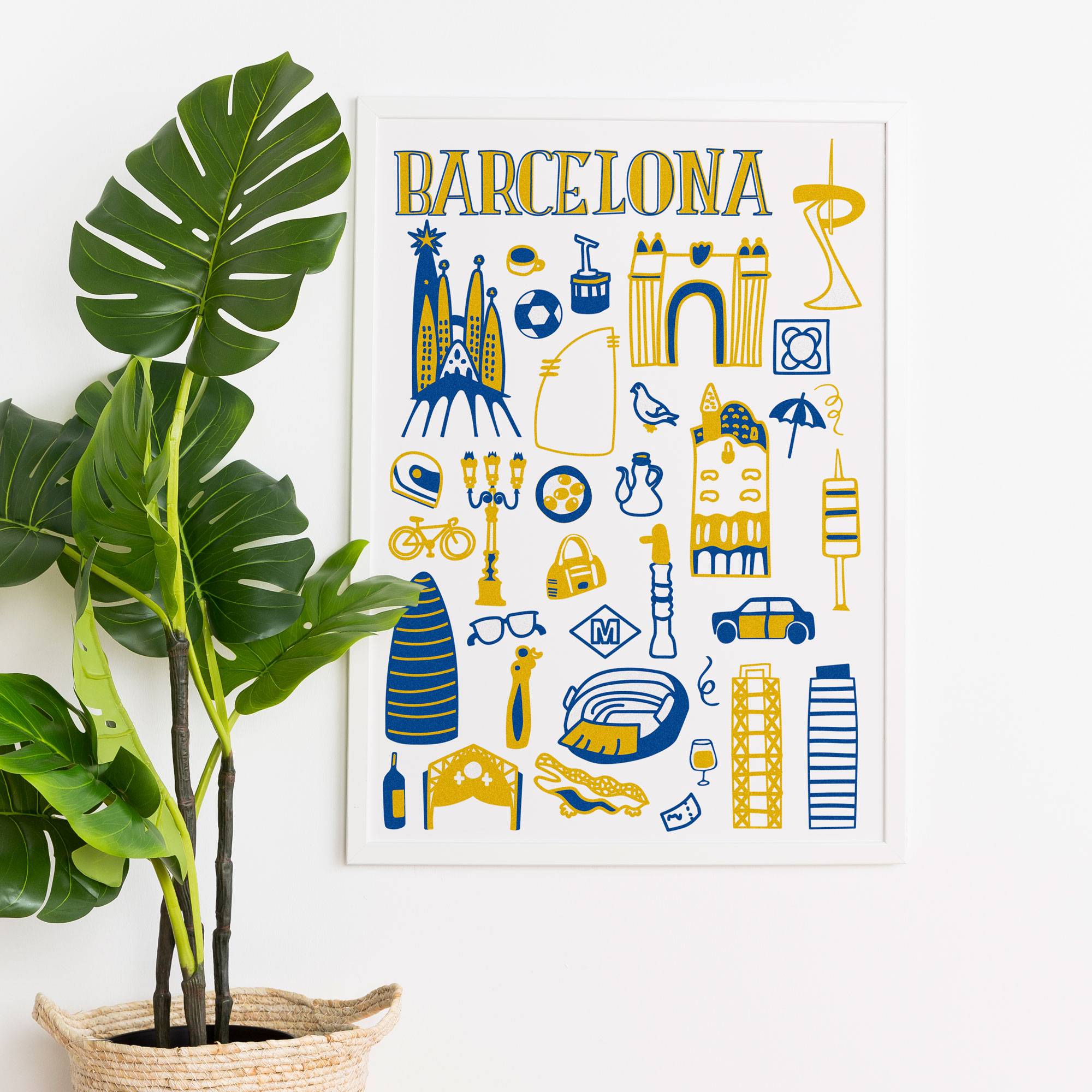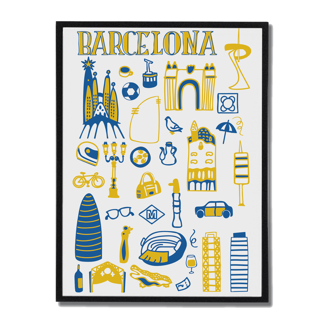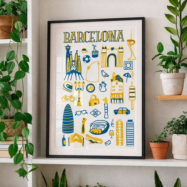 Póster ilustrado con los elementos más representativos y emblemáticos de Barcelona. Una lámina divertida y detallada que captura la esencia de la Ciudad Condal.