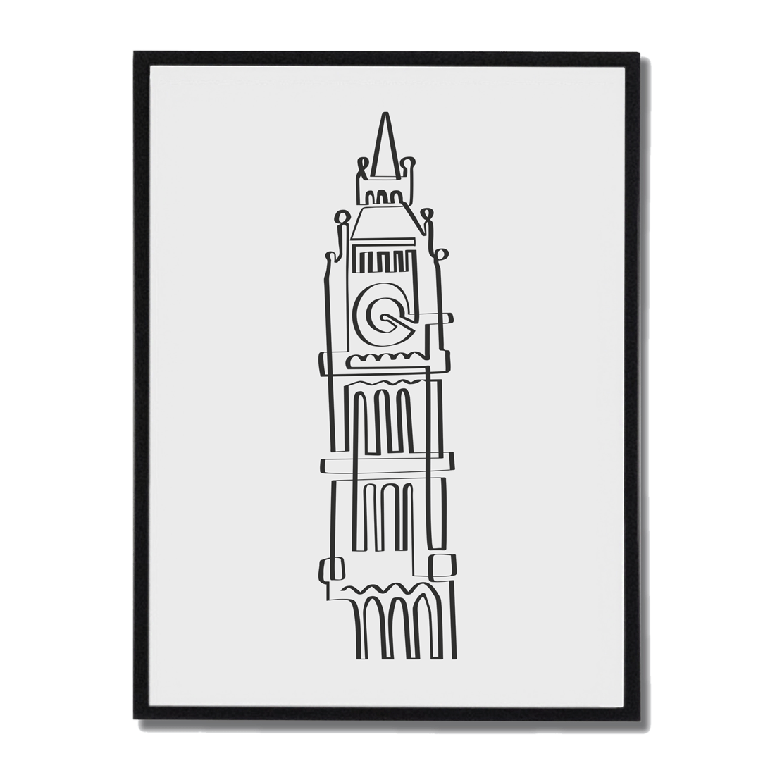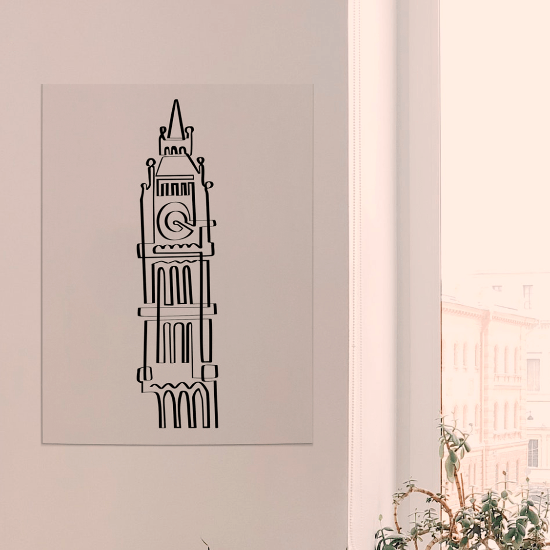 Il·lustració feta a un sol traç de la famosa torre Big Ben és una peça d’art minimalista i elegant.
