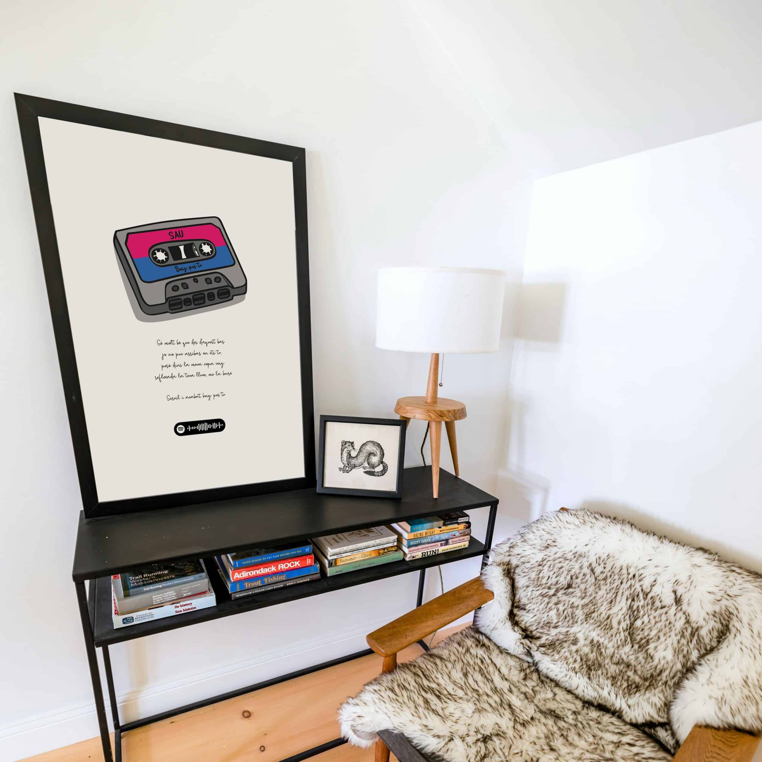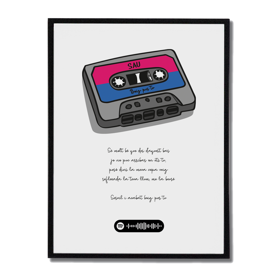Incluye un código de Spotify para que puedas escuchar la canción mientras disfrutas de la ilustración. Ideal como regalo original o lámina decorativa para fans de Sau y amantes de la música catalana.