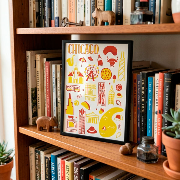 Ilustración de Chicago y sus elementos más característicos. Una lámina divertida que captura la vibrante esencia de la Ciudad de los Vientos.