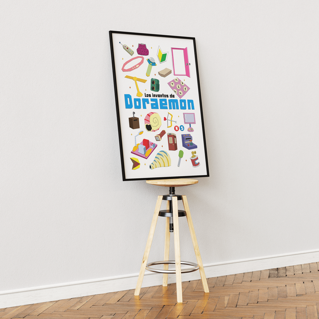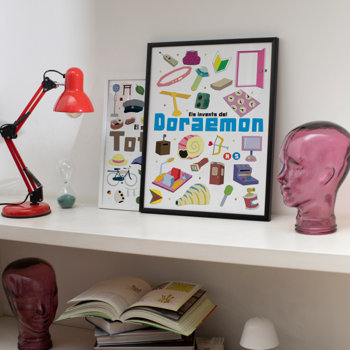 Póster ilustrado con los inventos más famosos de Doraemon: la puerta mágica, el casco volador, la máquina del tiempo, el túnel de Gulliver, la linterna ampliadora, etc. ¿Cuál es tu invento preferido?