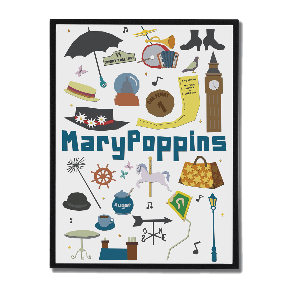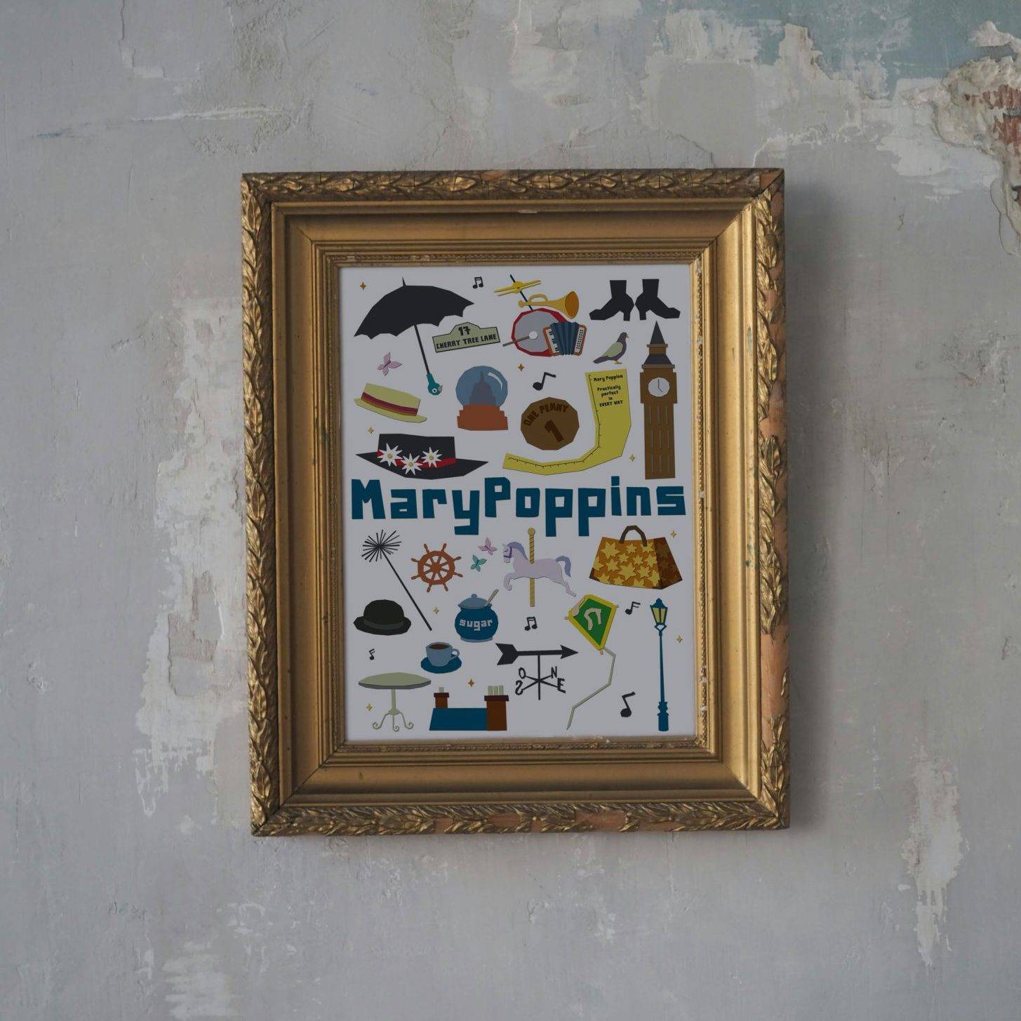 ¡Revive la nostalgia y el encanto de la película! Este póster ilustrado reúne los objetos más característicos de Mary Poppins.