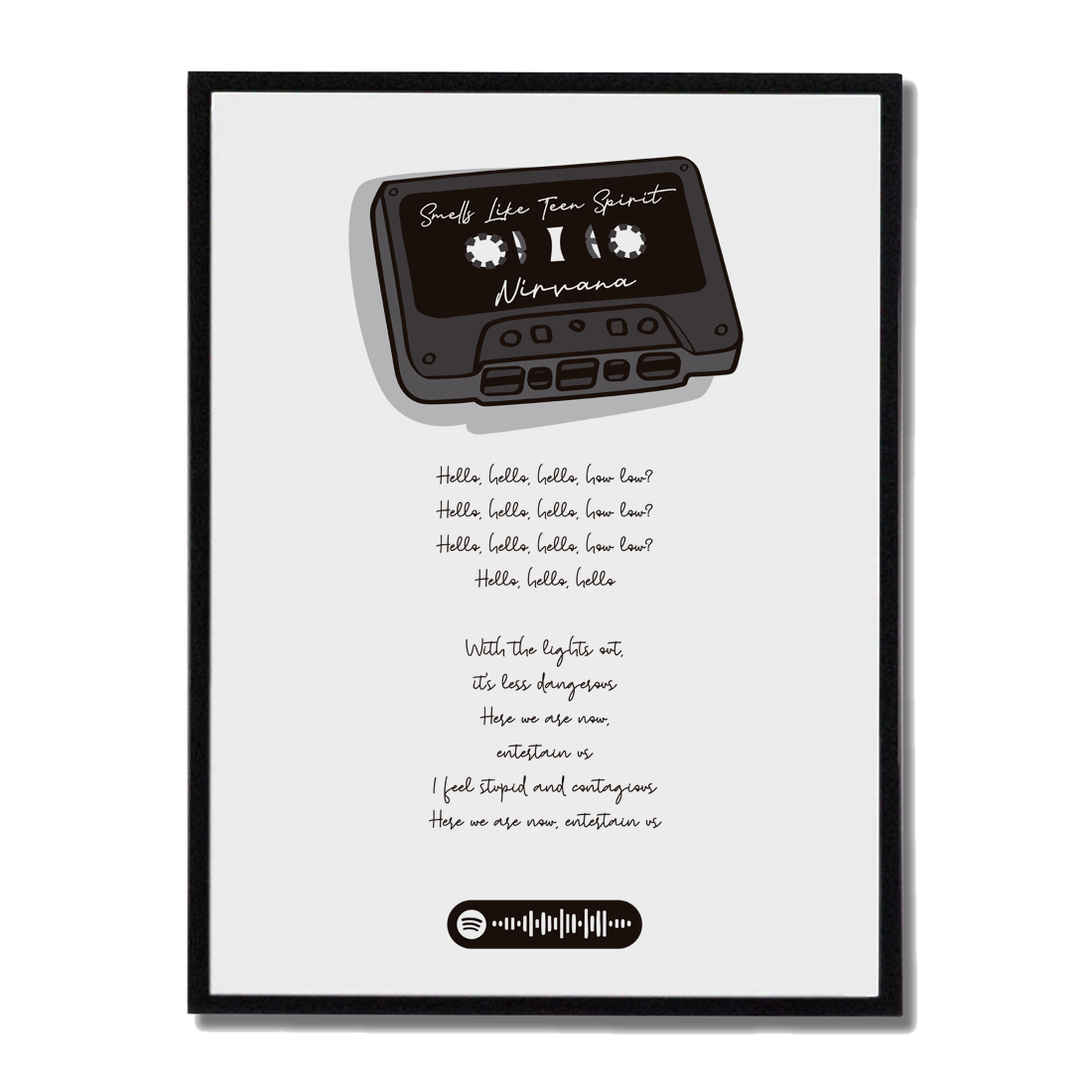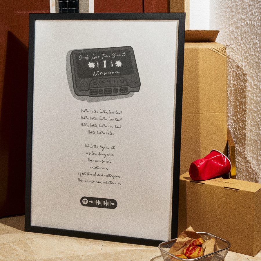 Un casete, una guitarra que no se te va de la cabeza. «Smells Like Teen Spirit» de Nirvana, ilustrado con el estilo que merece: crudo, directo y con código Spotify incluido para escucharla al instante.