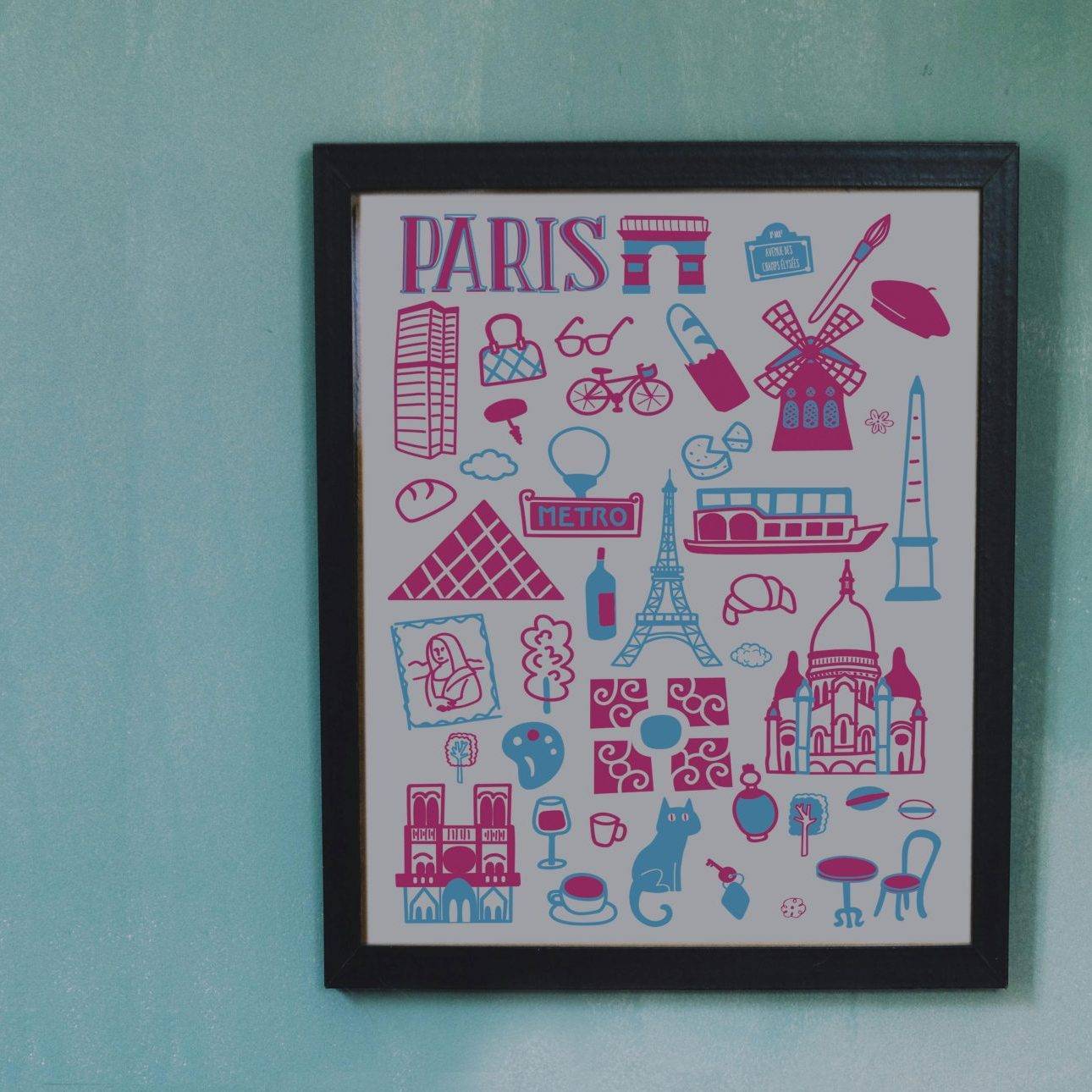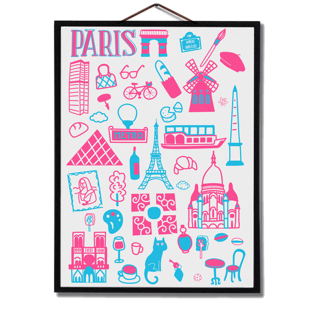 Una divertida lámina con detalles de edificios emblemáticos de la ciudad, así como de elementos característicos: la Torre Eiffel, el Louvre, el Arco de Triunfo, Vino, Café… Una forma artística de capturar la esencia de la Ciudad de la Luz.