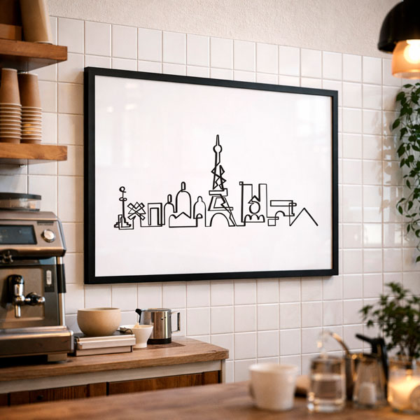 La silueta de París és un símbol de la bellesa, la cultura i la història d’aquesta ciutat. Aquesta il·lustració captura la seva essència en un sol traç orgànic que recorre els seus edificis més emblemàtics, com la Torre Eiffel, la Catedral de Notre Dame i el Louvre.