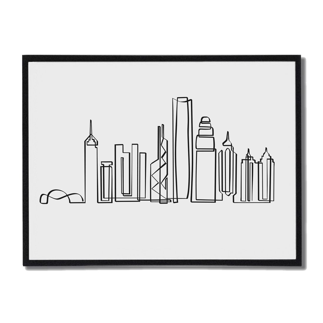 Poster del skyline de Hong Kong en una sola línea. Des de Peak hasta el Victor Harbour. Una línea orgánica que desafia las alturas, recorriendo las siluetas de los edificios más destacados de esta gran ciudad.