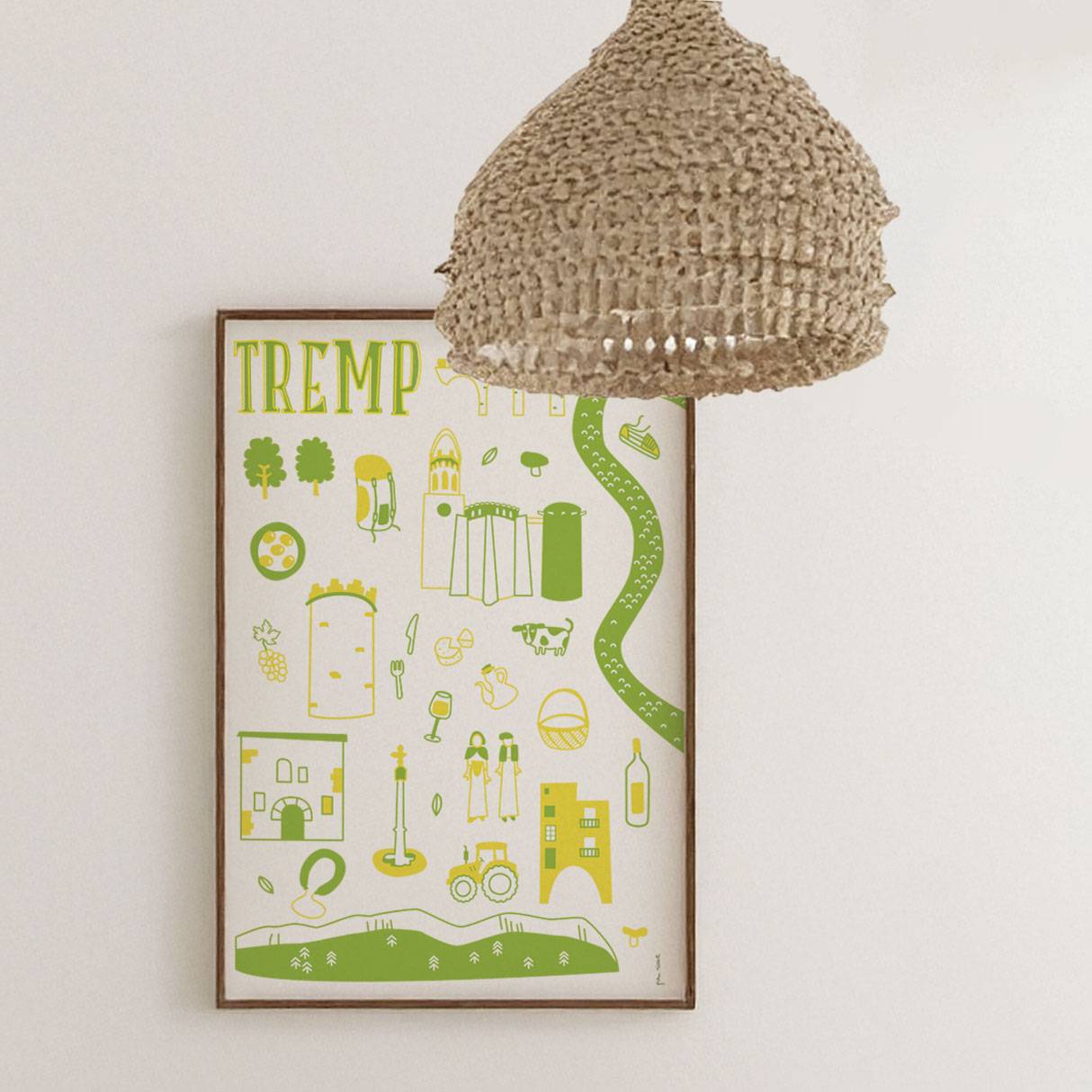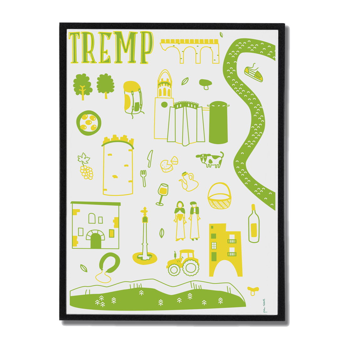 Esta ilustración destaca los elementos más representativos de este municipio de Lleida: desde la impresionante Sierra del Montsec hasta la histórica Basílica de Santa Maria de Valldeflors. Un póster a 2 colores que te sumerge en el encanto de este territorio.